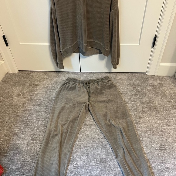 Cozy ribbed pajama set. Includes long-sleeve top and pants. Perfect for lounging.