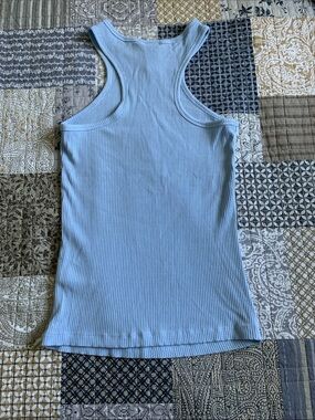 Slim ribbed racerback tank in light blue. Soft stretch knit for comfortable wear. Simple sleeveless silhouette for layering or solo wear. Casual staple that pairs easily with jeans or skirts.