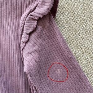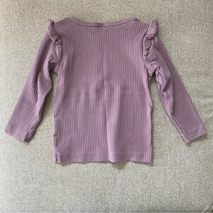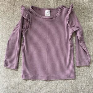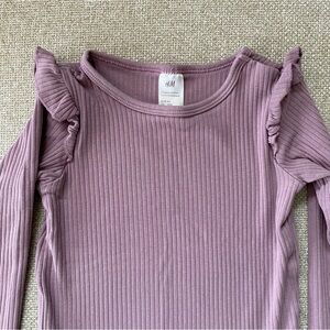 H&M lavender pants and long-sleeve top with ruffle details. Top has hidden snap at shoulder. Great condition with one flaw: small white spot on back of one sleeve, as shown in last photo.