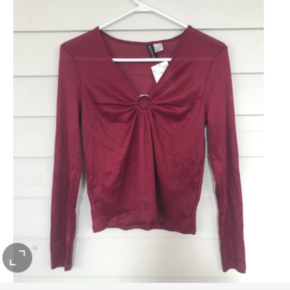 Long sleeved burgundy top from H&M. Gathered with a silver circle embellishment in the front. Brand new never worn. Size medium. Very in trend. It’s ribbed material with plenty of stretch.