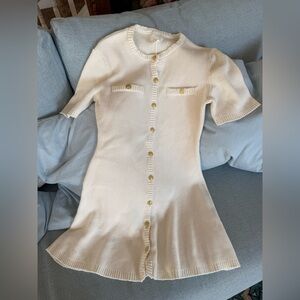 Short, fitted dress in soft, rib-knit cotton with ribbed trim. Round neckline, metal buttons full length of front, and mock chest pockets with button. Short sleeves and a gently flared skirt.