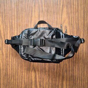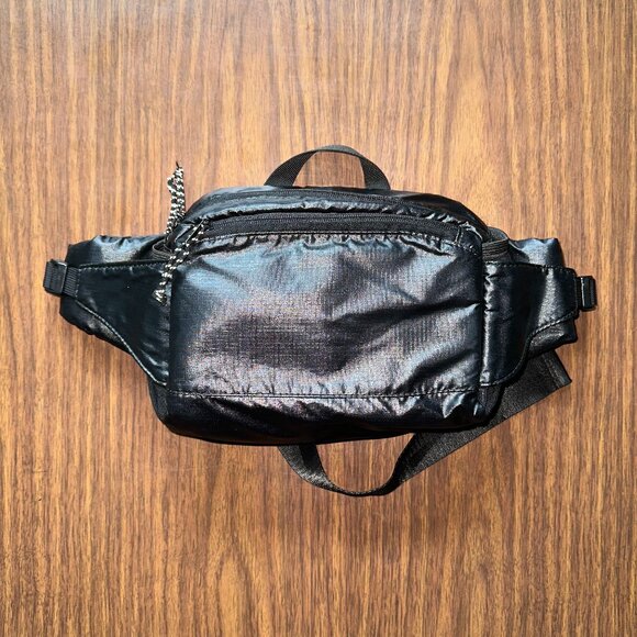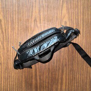 Used a couple times but don't use it anymore. Still in good wearable condition. Two zippered main pocket compartments with two smaller mesh side pockets. The main pocket has an inside pocket and can comfortably fit a 16.5oz. bottled water with lots of extra room. Main zippered pocket opening measures about 9.75" and the smaller zippered pocket opening measures about 6.75". Made of Polyester and Nylon.
