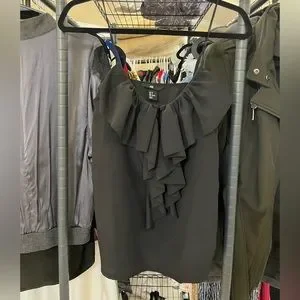 Cute black blouse with ruffle detail and hook and eye closure that in the front.