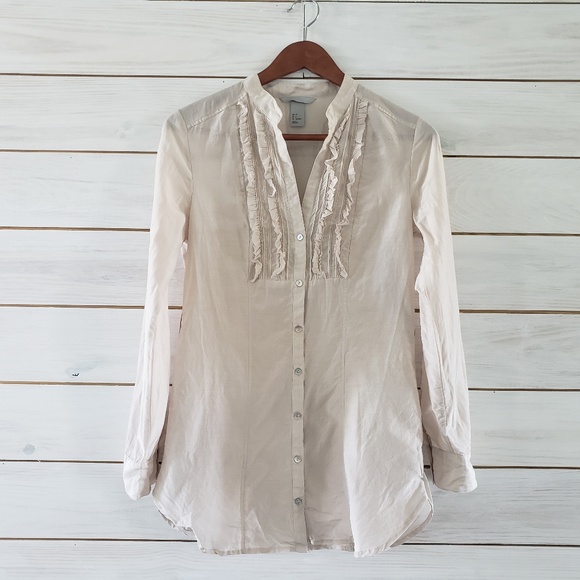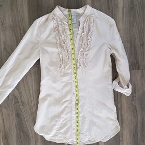 H&M Ruffle Collar Button Down Shirt in ivory color. Collared neck button down with ruffles at chest, cuffed sleeves with buttons. Machine wash, pre-owned.