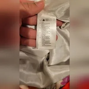 Blue floral ruffle dress with orange tie belt. Bodice crosses over (I added a small stitch so it wouldn't fly open on me. It can be easily snipped) Ruffle accent on neckline, and along the bottom of dress. Hits above knee and has a cute slit in front. Relaxed but sexy fit, very flattering. I wore this to a few events- wedding, bridal showers, cruise/vacation.