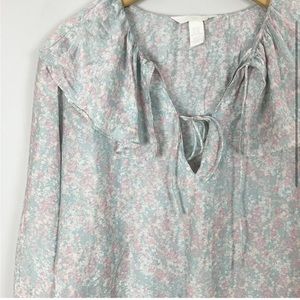 Floral peasant style top. Light blue pink and cream. Size large from H&M. Ties in front that can be worn loose. Fold over ruffle collar type with flowy sleeves.