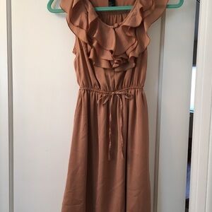 H&M ruffle satin dress in a tan/dark beige color. Elastic waist with faux drawstring. Lightweight, easy to wear and flattering.