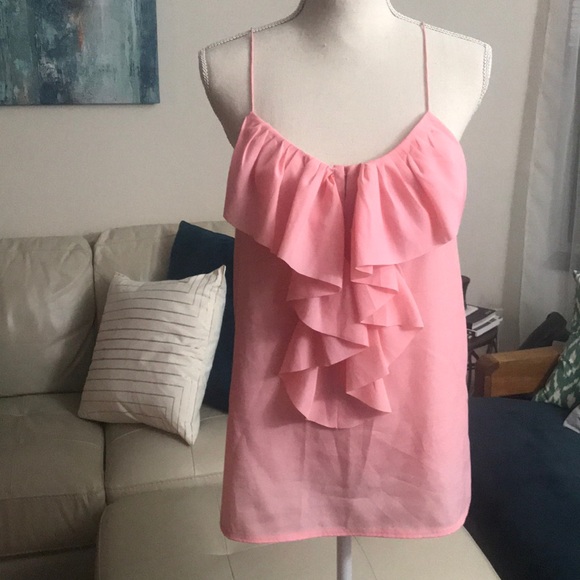 Pink ruffle front tank. Not real fitted and hits at the hip.