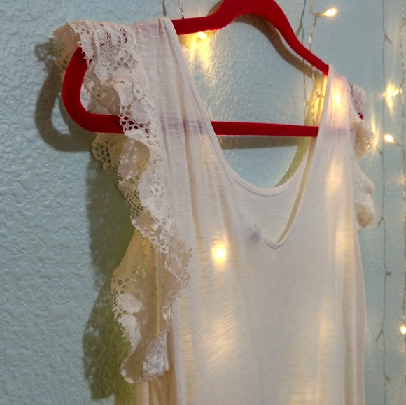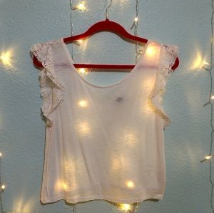Cropped tank with frilly lace sleeve accents. Scoop neck in the front with a low cut V in the back. Flowy fit. Lightly worn, great condition!