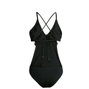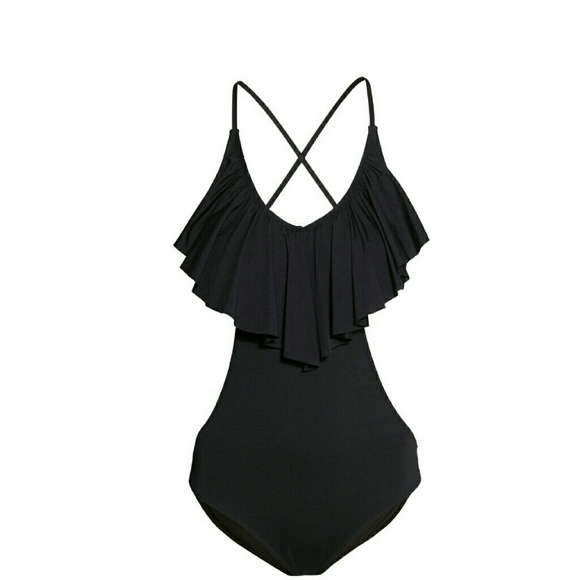 Lined swimsuit with a ruffle at top. Open back with crossover ties.