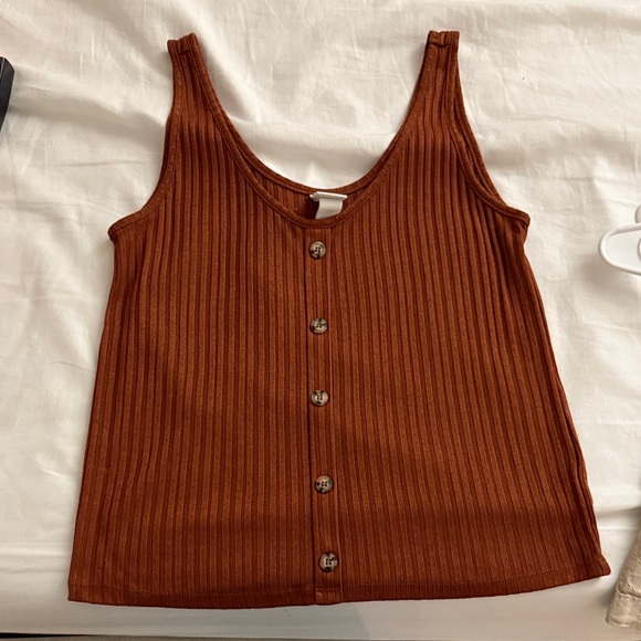 Chic rust ribbed tank with button-front design. Ideal for layering or solo wear. Adds warmth to any outfit.