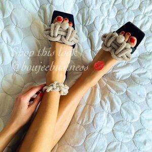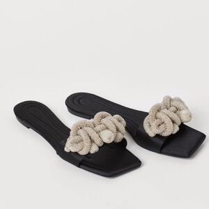 Slides in satin made from recycled polyester. Large decorative rope knots at top covered with recycled glass beads. Thermoplastic rubber soles.