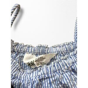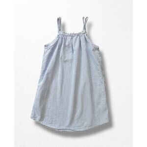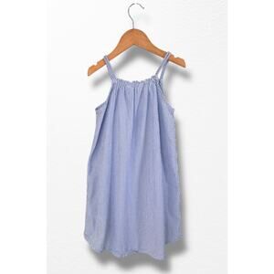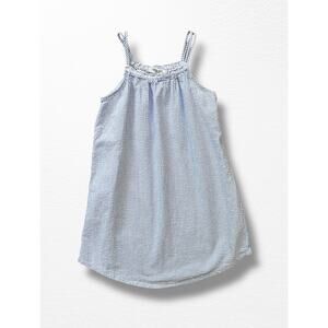 Light blue and white seersucker striped sundress from H&M in girls’ size 6x. A-line silhouette, ruffle at neckline, double spaghetti straps. 100% cotton. In excellent pre-loved condition.