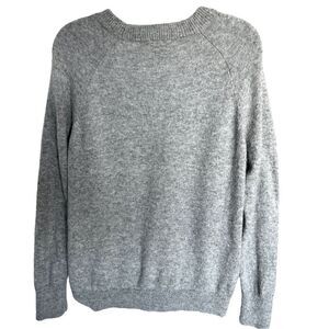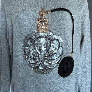 H&M gray sweater. It has a large 10 inch perfume bottle in the center with sequins, a bead, and ribbon. The neck, sleeve ends and bottom have small ribbing.