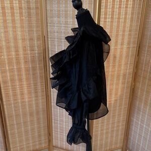Chic black blouse with dramatic ruffles. Such a fun statement top with ruffles all throughout the bodice and sleeves. Listing does not include lace white top and used in photos to add contrast. This piece is new without tags and has never been worn.