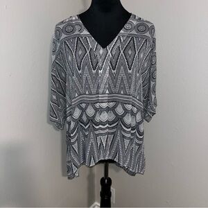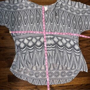 H&M Sheer Black & White Print Tunic Blouse Women’s Size 14. In preowned condition has wear with fading and pilling. Pit to pit about 24”. Top to bottom length about 27”. Check condition and sizing; No Returns. Measurements are approximate and provided as a courtesy, not a guarantee of fit. Actual colors may vary due to differences in lightings and screens.