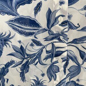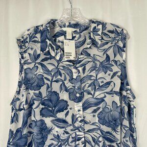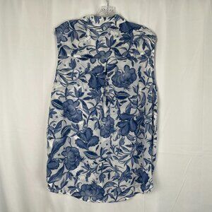 A sheer sleeveless button-down collard blouse with a lovely blue and white floral design. Perfect for the summer heat!