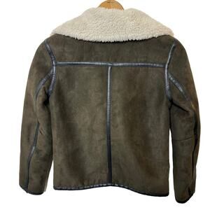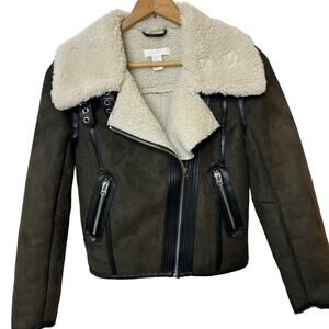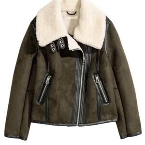H & M sherpa faux suede moto jacket. Faux green suede. Faux leather trim. Full zip jacket. Zippered Pockets. Fully lined with sherpa keeps you warm.