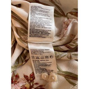 White beige floral mini shirt dress from HM, size 14, featuring a half button down, long sleeves and V neck. High low hem gives a bohemian touch. Chest 25, front length 34, back length 36, sleeve 23, sleeve from center of back 31. Made in Vietnam, machine washable, 100% Viscose.