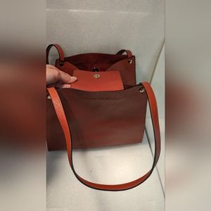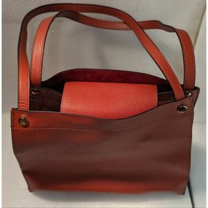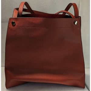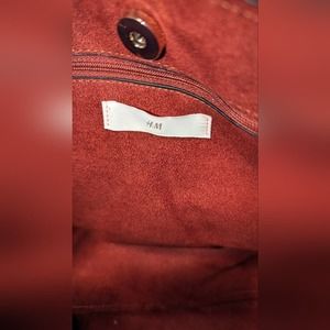 H&M Shopper in grained faux leather in orange with two handles and a flap at top with magnetic fastener. One inner compartment with zip. Faux suede inside. Size 5 x 11 x 12 1/2 in. Vegan leather NWOT