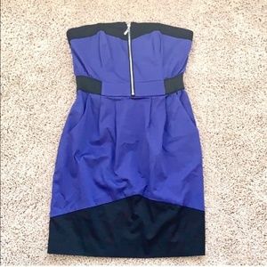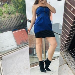 H&M really made OMG! dress so well put together that being low straight chest cut Shoulderless & strapless breasty will still self-hold! 36B wear w/out a bra, if open a front silver metal zipper - still holds, nothing reveals! WOW! Zip up back, pleated waistline, bodycon shaped skirt, 2 slit side pockets. Royal indigo blue, black, corset stands Lined top silicon line on top rim, fabric stretchy cotton.