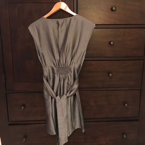 Beautiful silver color with slight metallic look. Wide waist fabric tie for flattering fit. Excellent condition! Smoke and pet free home.