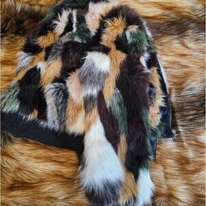 H&M faux rabbit camo zippered bomber style patchwork jacket is fun and definitely not like every other faux fur coat. A nod to retro rabbit patchwork coats but dine in a camo complete with a few patches of soft blush pink and an incredibly soft hand make this jacket perfect with jeans in a similar color and for all the casual fall and winter events. A size 4 it measures 21" long from the bottom of the collar to the hem, 34" bust, 16" shoulders (across the back), and 22" sleeves.