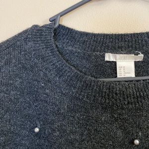 Dark gray sweater, pearls on front side and all along sleeves