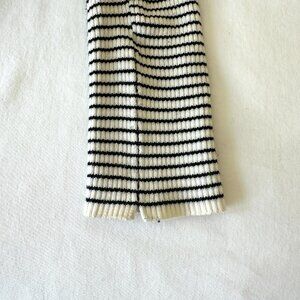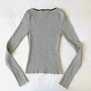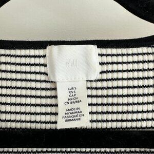 H&M black and white, pinstripe, skinny ribbed, knitted top with long sleeves and a scoop neckline. Made with 70% viscose and 30% polyamide stretch fabric.