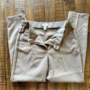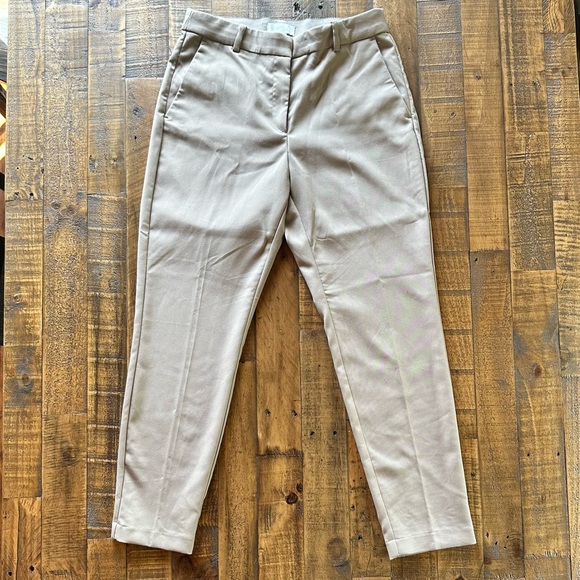 Ankle-length slacks in woven stretch fabric. Regular waist, concealed elasticized waistband, and zip fly with concealed hook-and-eye fastener. Side pockets, mock back pockets, and tapered legs.