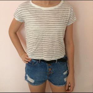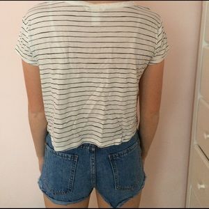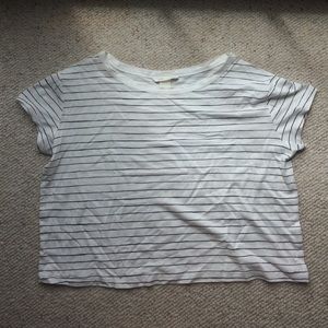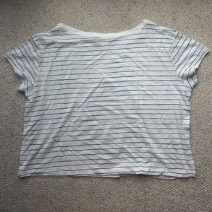 16" long from collar to bottom... Size XS but could definitely fit size S... Stripes are very dark navy blue almost black.... Worn once