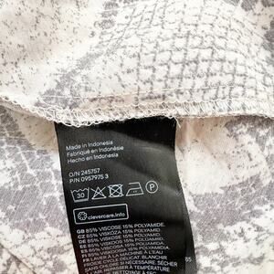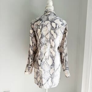 Stylish H&M snakeskin print shirt dress in size XS. This versatile piece can be worn as a button-down tunic top, belted shirt dress, or layered over leggings and jeans. Featuring a bold snakeskin animal print pattern, collared neckline, long sleeves with button cuffs, and a tie-waist detail for a flattering fit. Lightweight fabric blend of 85% viscose and 15% polyamide for a soft, flowy feel. Perfect for casual wear, night out, or chic office layering.