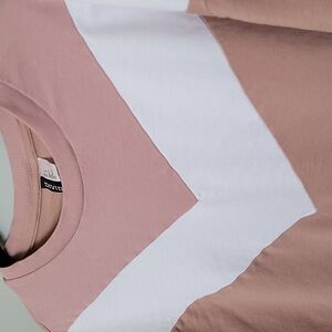 All over a tan color with white chevron and pink section. Casual, stranger things vibe, 80's, 90's, school,preppy, oversized,layer, spring, fall, weekend, hang out, autumn, neutral