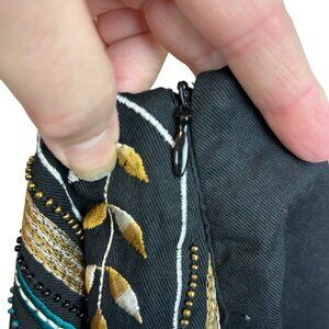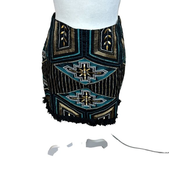 Super cute mini/knee length skirt by H&M. Has a southwestern print with sequins/beads on front side. Solid black color on back. Has side zipper closure. Has fringe on bottom hem.