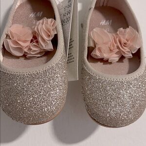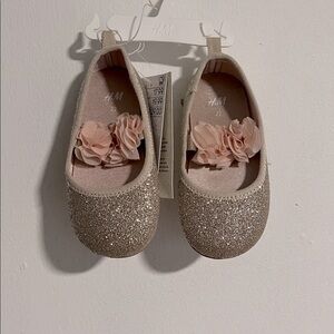 Charming H&M shoes with glittery gold finish. Adorned with delicate floral accents. Ideal for special occasions.