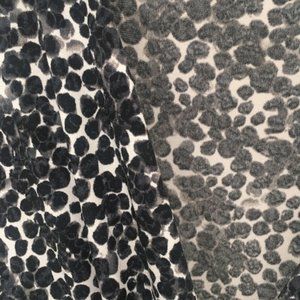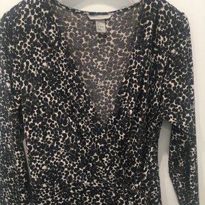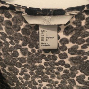 Sz L H&M wrap front dress, DVF style, with a blackish dark bluish grey and white spotted pattern. The fabric is very soft and comfortable. There are a couple stitches coming undone near the tag, but nothing that affects the look or function. Super cute and flattering!
