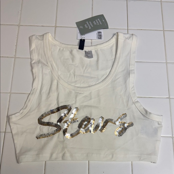 Stylish white crop top featuring a sequin logo design. Perfect for casual outings. from h&m , new with tags never worn