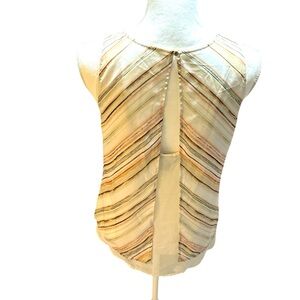 Elevate your wardrobe with this chic sleeveless top. Featuring sheer layers and a stylish striped pattern in cream and tan.