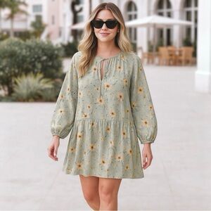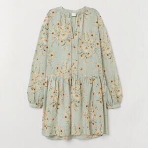 H&M Sunflowers Floral Balloon Sleeve Boxy Relaxed Drop Waist Shift Dress Size 12