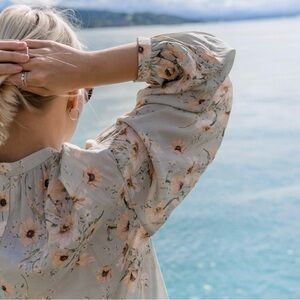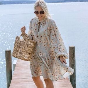 floral shabby chic cottagecore prairie peasant earthy neutral casual spring event wedding guest boxy relaxed beachy coastal boho bohemian college sorority recruitment rush panhellenic summer cocktail bloggers blogger favorite retro 60s 70s garden girl sunflowers drop waist lightweight flowy