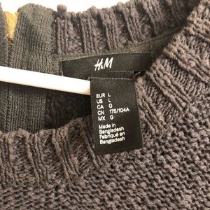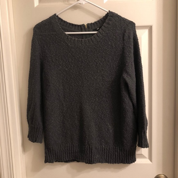 H&M distressed grey sweater. Gold quarter zip on the back. 3/4 length sleeves. Women’s size large. Good Condition; hardly worn, no stains, no rips or holes.