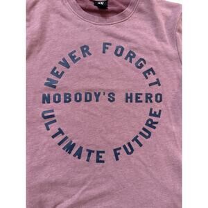 Design: Circular front graphic with the text "NEVER FORGET NOBODY'S HERO ULTIMATE FUTURE"