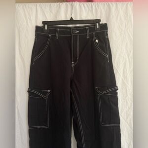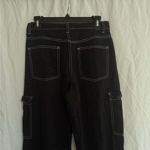 Stylish black cargo pants featuring white stitching. Perfect for casual wear.