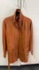 Stylish tan leather jacket with a sleek design. Features a front zipper and belt for a tailored fit. Perfect for a chic look.