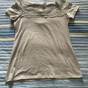 This stylish blouse from H&M features a fitted design with short sleeves and a unique bib collar. The tan and cream colors add a touch of elegance, while the embellished details make it a standout piece for any occasion. New with tags, but please look at photos for imperfections from sitting around not used! (Little imprint bump and string)