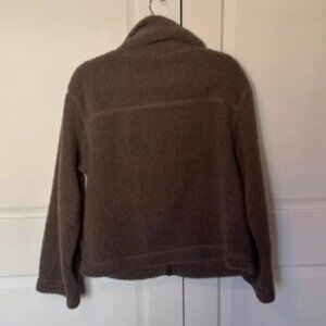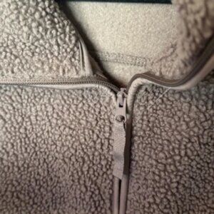 Warm taupe sherpa jacket with zip closure. Ideal for cool weather.