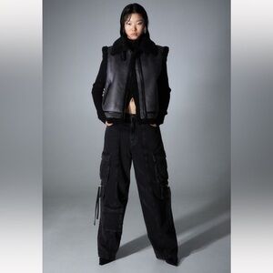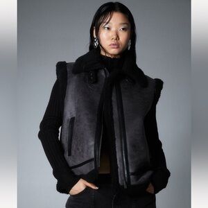 Size US Small, new without tags, never worn, only tried on. Winter 2023, sold out online. Vest in coated fabric with lining and collar in soft teddy fleece. Tab at top with a metal buckle, zipper at front, and welt front pockets. Article number: 1181246003 Model size: The model is 177cm/5'10" and wears a size M Size: Back: Length: 27.9 cm (Size M), Chest: Circumference: 119.5 cm (Size M), Shoulder: Width: 49.4 cm (Size M) Length: Regular length Sleeve length: Sleeveless Fit: Regular fit Collar: Turn-down Collar Style: Bomber Jacket Description: Dark gray/black