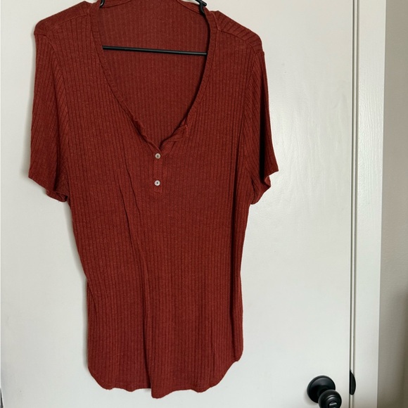H&M ribbed top in terracotta. Features short sleeves and button accents.