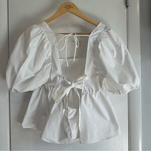 H&M Tie Detail Puff-Sleeved Peplum Blouse. White. Size: Large.