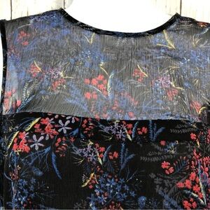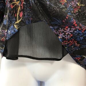 Black with multicolored floral pattern, sheer top,bodice has lining, one button closure with keyhole on back, tiered balloon sheer sleeves, colors may vary due to lighting, good used condition, Sz: 6